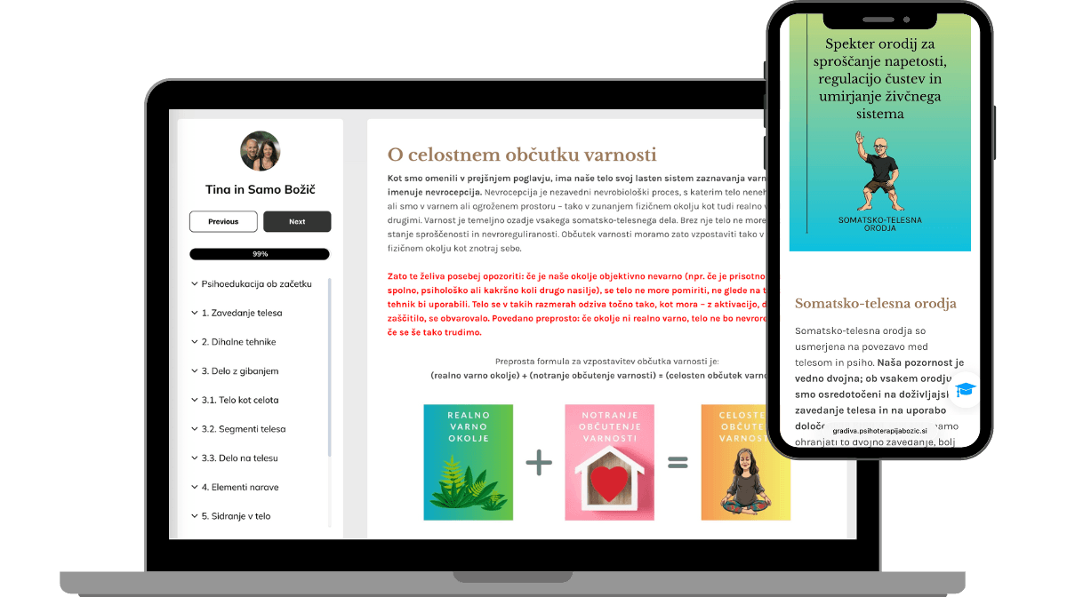 Praktični online vodič z več kot 50 preizkušenimi somatsko-telesnimi orodji, z jedrnato razlago, zakaj delujejo, in jasnimi smernicami za njihovo varno in učinkovito uporabo.